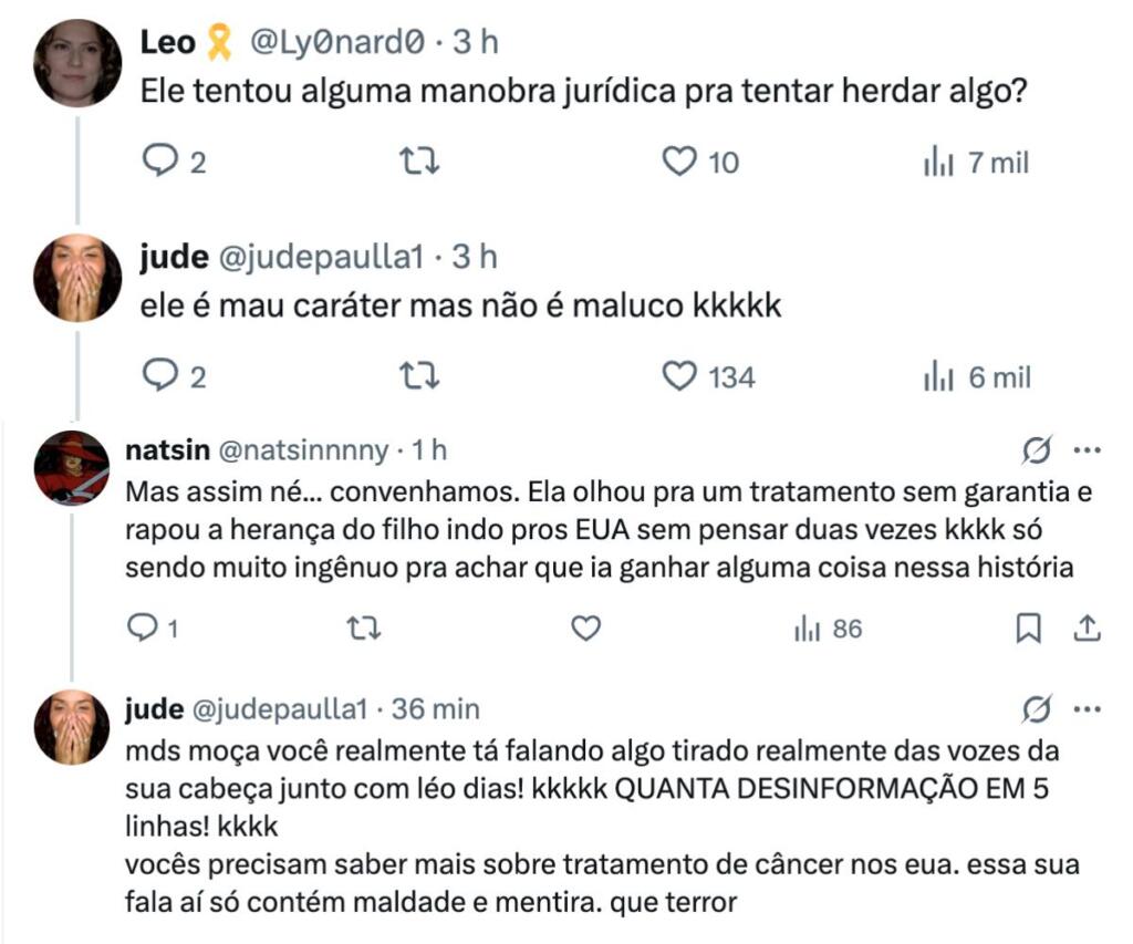 Além disso, a repercussão da postagem gerou novas reações. “Mas assim né… convenhamos. Ela olhou pra um tratamento sem garantia e rapou a herança do filho indo pros EUA sem pensar duas vezes kkkk só sendo muito ingênuo pra achar que ia ganhar alguma coisa nessa história”, comentou uma seguidora, ecoando a indignação que tomou conta das redes após o desabafo de Ju de Paulla.