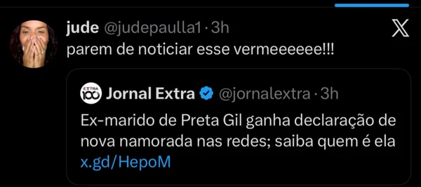 Na tarde desta quarta-feira (26/11), Ju de Paulla, uma das melhores amigas de Preta Gil (1974-2025), movimentou as redes sociais ao reagir com indignação a uma notícia envolvendo Rodrigo Godoy, ex-marido da cantora. A DJ usou o X, antigo Twitter, para demonstrar incômodo com a repercussão sobre a vida amorosa do personal trainer.