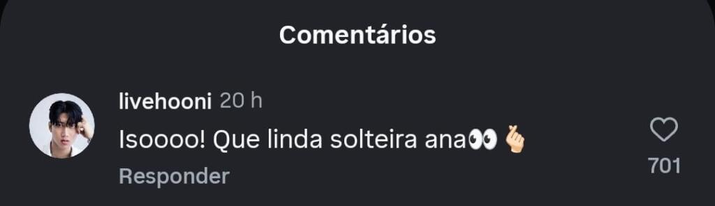 Logo depois, Hooni comentou em português na publicação da cantora: “Iso! Que linda solteira Ana”, acompanhado de um emoji de olhinhos. Com isso, a atitude deixou clara a investida e, rapidamente, internautas passaram a “shippar” os dois, alimentando rumores e comentários bem-humorados.