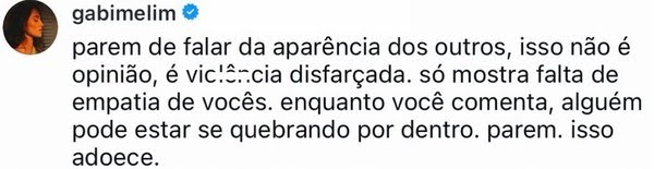 Depois disso, as imagens do look viralizaram e ampliaram ainda mais a repercussão. Em paralelo, comentários publicados na página Lorena Magazine reuniram críticas e ataques. Nesse contexto, Gabi Melim se posicionou contra as mensagens negativas. “Parem de falar da aparência dos outros, isso não é opinião, é violência disfarçada. Só mostra falta de empatia de vocês. enquanto você comenta, alguém pode estar se quebrando por dentro. Parem com isso”, pediu ela.