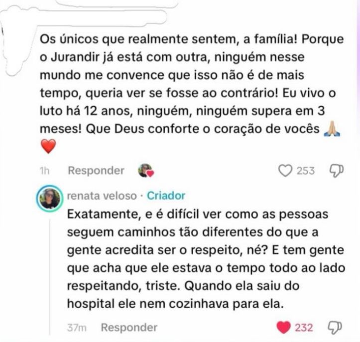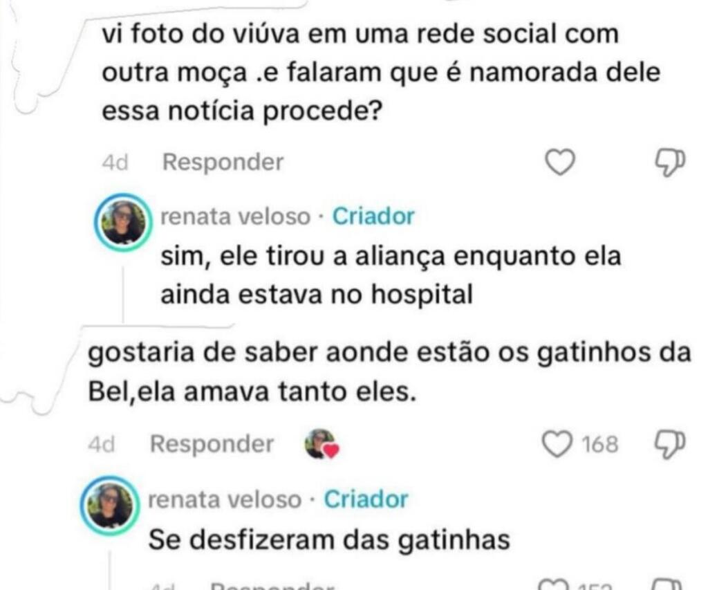Diante da repercussão, Renata Veloso, irmã de Isabel, decidiu se manifestar e respondeu diretamente aos seguidores. Ao ser questionada sobre o novo relacionamento, ela afirmou: “Sim, ele tirou a aliança enquanto ela ainda estava no hospital”. Em seguida, ao comentar a postura do viúvo durante a doença, acrescentou: “Exatamente, e é difícil ver como as pessoas seguem caminhos tão diferentes do que a gente acredita ser o respeito, né? E tem gente que acha que ele estava o tempo todo ao lado respeitando, triste. Quando ela saiu do hospital ele nem cozinhava para ela.”