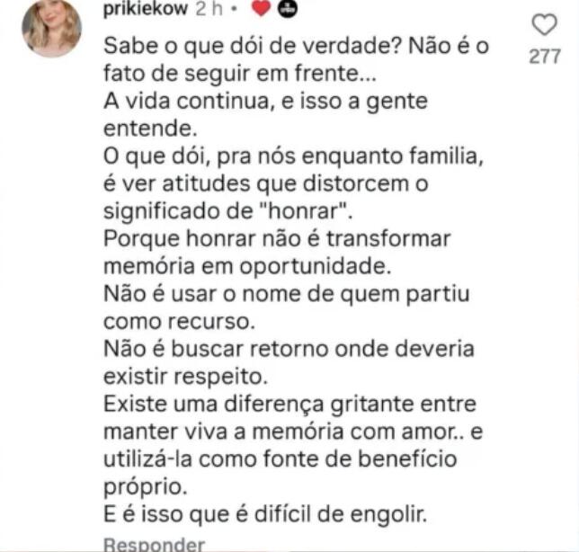 Na mesma direção, Priscila Kiekow, irmã da influenciadora por parte de mãe, também criticou a postura do viúvo. Em comentário publicado nas redes sociais, ela declarou: “Sabe o que dói de verdade? Não é o fato de seguir em frente… A vida continua, e isso a gente entende. O que dói, pra nós enquanto família, é ver atitudes que distorcem o significado de ‘honrar’. Porque honrar não é transformar memória em oportunidade. Não é usar o nome de quem partiu como recurso. Não é buscar retorno onde deveria existir respeito. Existe uma diferença gritante entre manter viva a memória com amor.. e utilizá-la como fonte de benefício próprio. E é isso que é difícil de engolir.”