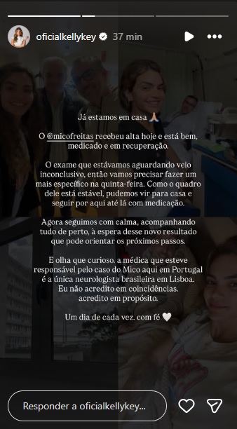 Além disso, Kelly Key destacou a importância de seguir acompanhando o quadro de perto e manter a cautela no processo de recuperação. “Como o quadro dele está estável, pudemos vir para casa e seguir por aqui até lá com medicação. Agora seguimos com calma, acompanhando tudo de perto, à espera desse novo resultado que pode orientar os próximos passos. E olha que curioso, a médica que esteve responsável pelo caso do Mico aqui em Portugal é a única neurologista brasileira em Lisboa. Eu não acredito em coincidências, acredito em propósitos. Um dia de cada vez com fé”, concluiu.