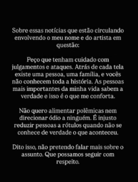 No entanto, com a intensa repercussão, Dani decidiu se pronunciar em seu perfil no Instagram. “Peço que tenham cuidado com julgamentos e ataques. Atrás de cada tela existe uma pessoa, uma família”, escreveu. Ela ainda completou: “As pessoas mais importantes da minha vida sabem a verdade e isso é o que me conforta”.