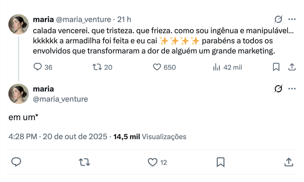“Calada vencerei. Que tristeza. Que frieza. Como sou ingênua e manipulável… A armadilha foi feita e eu caí. Parabéns a todos os envolvidos que transformaram a dor de alguém um grande marketing”, escreveu Maria no X, antigo Twitter, deixando evidente o tom de desilusão com o término.
