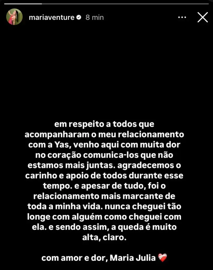 “Em respeito a todos que acompanharam o meu relacionamento com a Yas, venho aqui com muita dor no coração comunicá-los que não estamos mais juntas”, iniciou o texto. Logo em seguida, completou: “Agradecemos o carinho e apoio de todos durante esse tempo. E apesar de tudo, foi o relacionamento mais marcante de toda a minha vida. Nunca cheguei tão longe com alguém como cheguei com ela. E sendo assim, a queda é muito alta, claro. Com amor e dor, Maria Julia.”