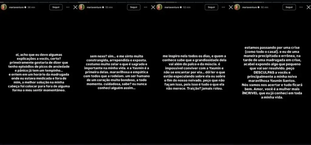 Depois do pronunciamento, Maria Venture apagou as fotos do casal e voltou a se manifestar em outra live, visivelmente abalada. “Eu só tive uma decepção muito grande, que eu nunca pensei que teria, é só por isso que eu tô desse jeito”, disse, emocionada. Em seguida, ela reconheceu que se arrependeu de expor a situação, mas contou que só buscava ajuda para lidar com o momento difícil.