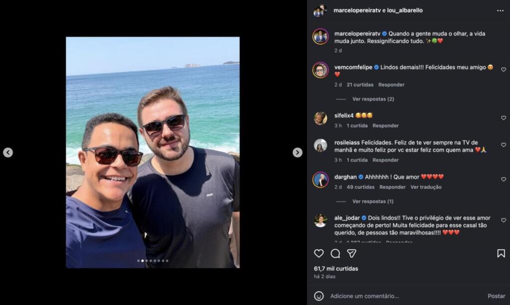 Nos comentários, profissionais conhecidos do jornalismo demonstraram apoio e entusiasmo. “Lindos! Felicidades! Eu vibro!”, escreveu a jornalista Sabina Simonato. Outras mensagens também celebraram o momento vivido pelo apresentador. “Que bonito ver como a vida vai se reorganizando quando a gente se permite olhar com mais verdade e carinho para o que sente”, comentou Cláudio Robert.