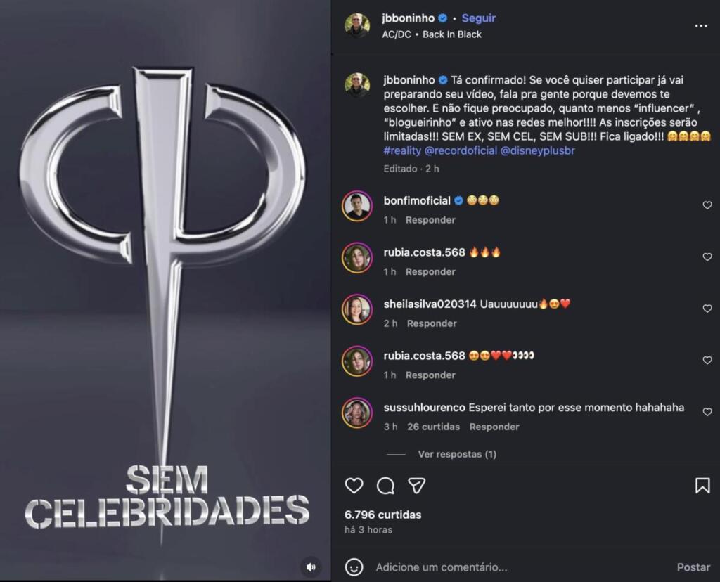 “Se você quiser participar já vai preparando seu vídeo, fala pra gente porque devemos te escolher. E não fique preocupado, quanto menos ‘influencer’, ‘blogueirinho’ e ativo nas redes melhor! As inscrições serão limitadas! SEM EX, SEM CEL, SEM SUB!!! Fica ligado!”, declarou Boninho enquanto exibiu a logomarca oficial do reality. O diretor também antecipou que a estreia deve acontecer entre abril e julho de 2026.