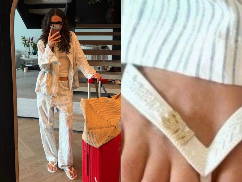 Ela aindao combinou o look com um top cropped branco, mantendo a proposta leve e adequada ao clima da cidade. No entanto, quem realmente roubou a cena foi a bolsa da casa de moda espanhola LOEWE. O modelo escolhido é uma tote bege de palha trançada, com detalhe de pesponto, parte superior aberta e alças duplas em couro.