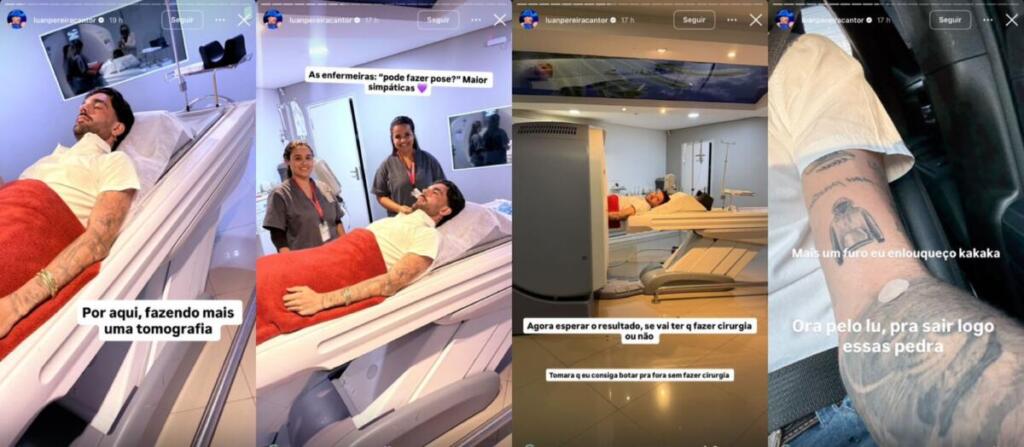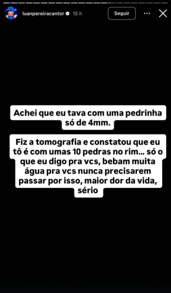 Inicialmente, Luan acreditava que enfrentava apenas um pequeno cálculo renal, mas os exames mostraram algo bem pior. “Achei que estava com uma pedrinha só de 4 mm. Fiz tomografia e constatou que eu estou é com umas 10 pedras no rim… só o que eu digo para vocês é: bebam muita água para vocês nunca precisarem passar por isso, maior dor da vida, sério”, desabafou o cantor, que recebeu uma enxurrada de mensagens de carinho dos fãs.