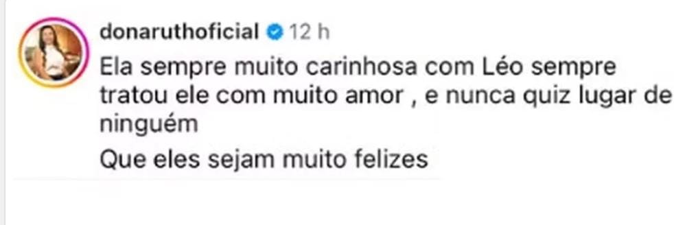 Diante da repercussão, Dona Ruth decidiu intervir publicamente e saiu em defesa da influenciadora. “Ela sempre [é] muito carinhosa com o Léo, sempre tratou ele com muito amor e nunca quis [ocupar o] lugar de ninguém”, afirmou, em uma fala interpretada como recado direto aos críticos.