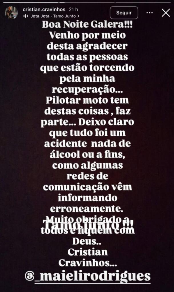 Logo em seguida, Cristian agradeceu as mensagens de apoio e rebateu especulações sobre o uso de substâncias ilícitas. Ele escreveu: “Venho por meio desta agradecer todas as pessoas que estão torcendo pela minha recuperação. Pilotar moto tem destas coisas, faz parte. Deixo claro que tudo foi um acidente. Nada de álcool ou afins, como algumas redes de comunicação vêm informando erroneamente”.