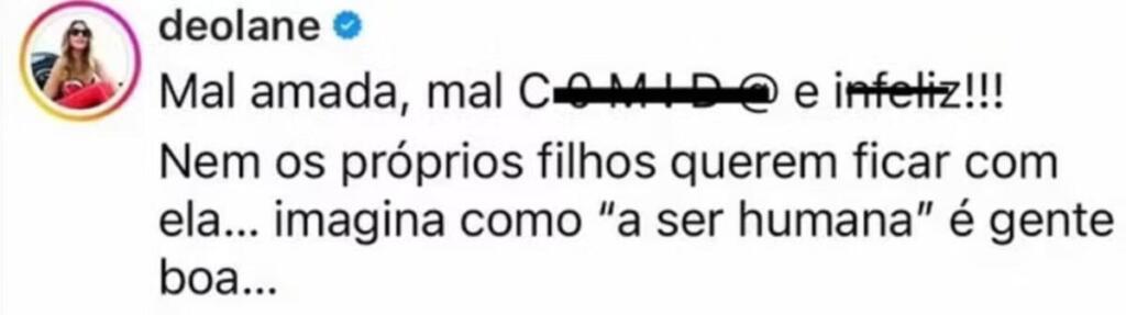 Além disso, ela trouxe à tona um episódio pessoal envolvendo o filho mais velho de Luana para reforçar as críticas. Ao mencionar a mudança do adolescente para o Brasil, a influenciadora escreveu: “Mal amada, mal comida e infeliz. Nem os próprios filhos querem ficar com ela… Imagina como ‘a ser humana’ é gente boa”, o que rapidamente ganhou repercussão.