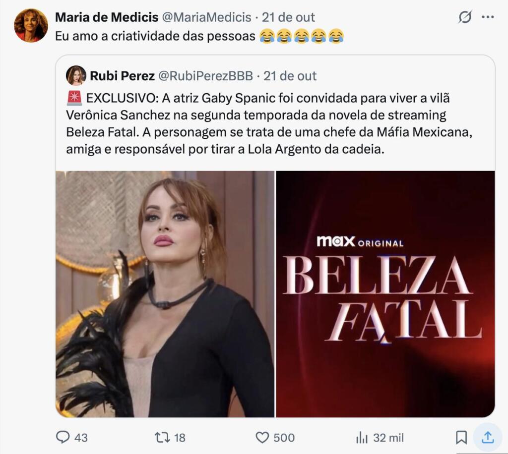 Ao se deparar com os boatos, Maria de Médicis reagiu com descontração e bom humor. “Eu amo a criatividade das pessoas”, escreveu no X, acompanhando a publicação com emojis de risada. Mas, deixando claro que encara a história como uma brincadeira da internet.