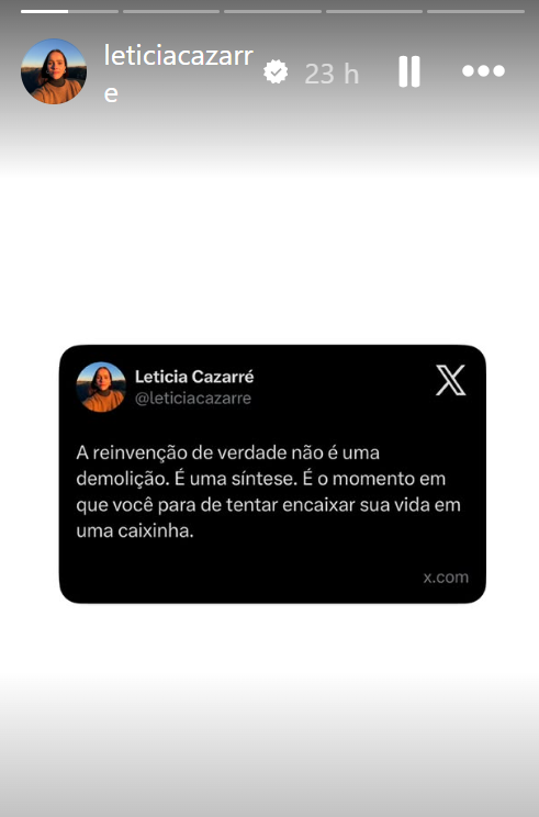 Nesse contexto, Leticia compartilhou uma reflexão nos Stories enquanto o projeto “O Farol & A Forja” continuava gerando debate. Apresentado como “o maior encontro de homens do Brasil”, o evento dividiu opiniões desde o anúncio. “A reinvenção de verdade não é uma demolição. É uma síntese. É o momento em que você para de tentar encaixar sua vida em uma caixinha”, escreveu.