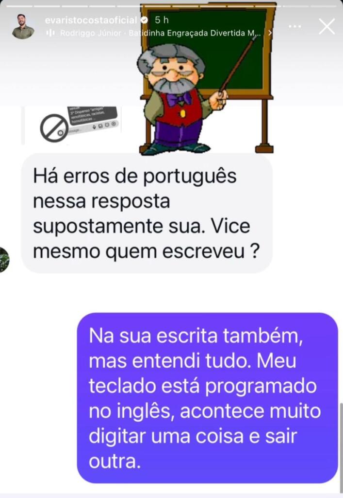 Sendo assim, momentos depois o jornalista recebeu uma enxurrada de mensagens dos seguidores e repostou em sua rede social. Mas, uma mensagem em questão chamou sua atenção! Após uma seguidora apontar um erro ortográfico e sua escrita no stories anterior. Rapidamente, Evaristo a respondeu e apontou erros em sua escrita. Veja no print abaixo: