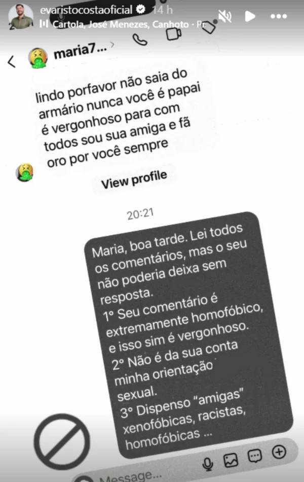 Evaristo, por sua vez, decidiu responder diretamente e sem rodeios. “Leio todos os comentários, mas o seu não poderia deixar sem resposta. 1º seu comentário é extremamente homofóbico e isso sim é vergonhoso”, afirmou.
