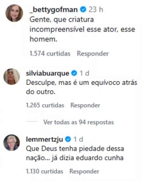 Por outro lado, a repercussão tomou outro rumo quando artistas reagiram publicamente à proposta. Nomes como Elisa Lucinda, Julia Lemmertz, Guta Stresser, Silvia Buarque e Paulo Betti criticaram a iniciativa. “Gente, que criatura incompreensível esse ator, esse homem”, escreveu Betty Gofman, ampliando a discussão.