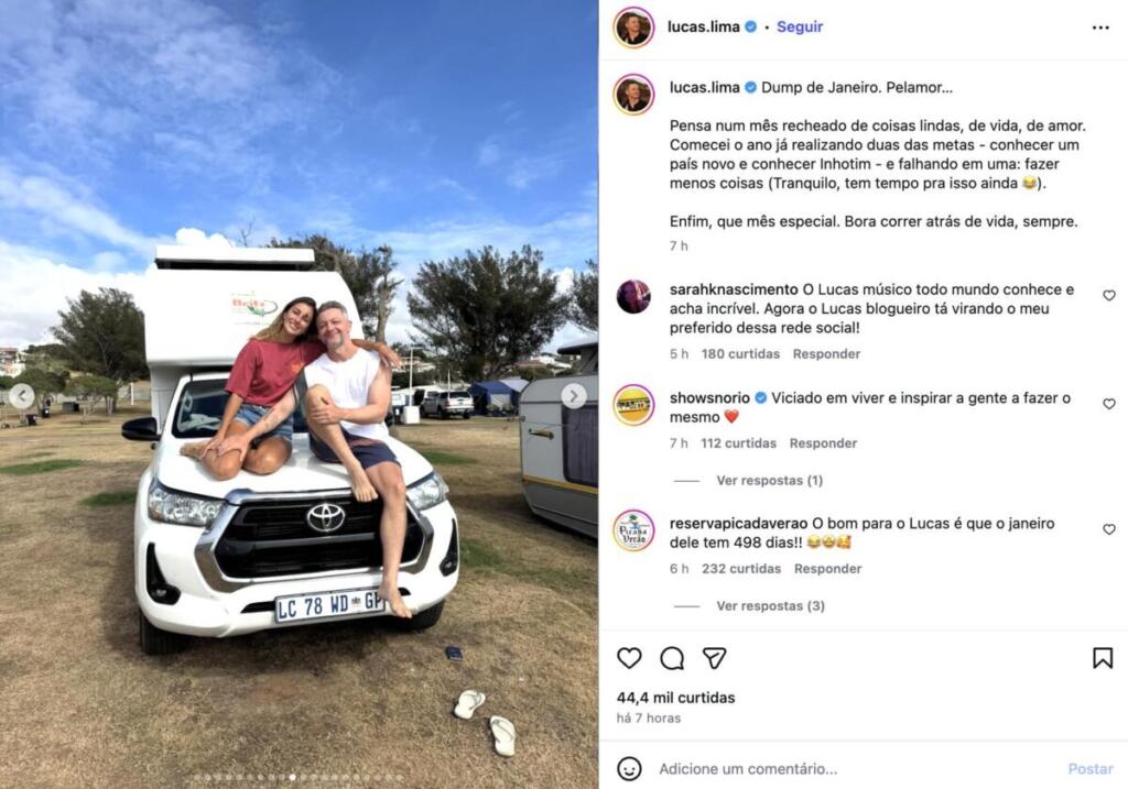 Na legenda da publicação, Lucas fez um balanço direto do início do ano e celebrou as metas cumpridas. “Dump de Janeiro. Pelamor… Pensa num mês recheado de coisas lindas, de vida, de amor. Comecei o ano já realizando duas das metas. Conhecer um país novo e conhecer Inhotim – e falhando em uma: fazer menos coisas (tranquilo, tem tempo pra isso ainda 😂). Enfim, que mês especial. Bora correr atrás de vida, sempre”, escreveu.