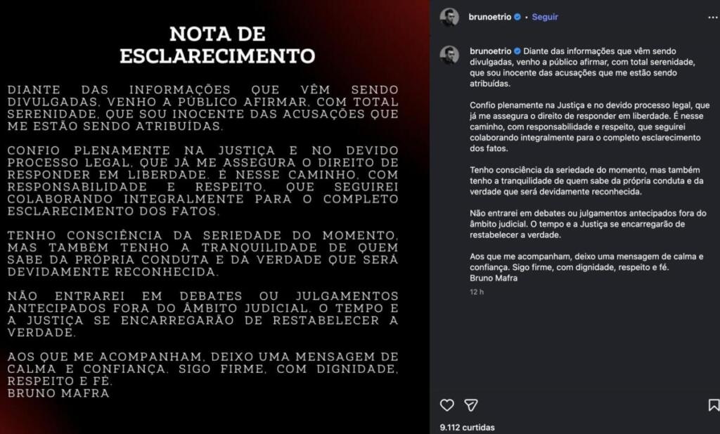 Bruno Mafra decidiu se manifestar publicamente nesta sexta-feira (27/03) diante da repercussão do caso. Em sua declaração, ele afirmou que mantém a tranquilidade e sustenta sua inocência. “Diante das informações que vêm sendo divulgadas, venho a público afirmar, com total serenidade, que sou inocente das acusações que me estão sendo atribuídas.” Além disso, ele destacou que confia plenamente na Justiça e no devido processo legal e ressaltou que continuará colaborando para o esclarecimento dos fatos.