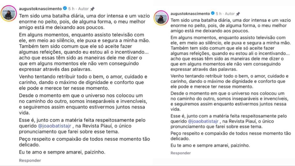 Ele também descreveu como pequenos gestos se tornaram formas silenciosas de comunicação entre os dois. Milton aperta sua mão enquanto assistem televisão ou se alimenta apenas quando o vê por perto. “Desde o momento em que o universo nos colocou um no caminho do outro, somos inseparáveis e invencíveis”, afirmou Augusto, que finalizou o relato pedindo respeito: “Eu te amo e sempre amarei, paizinho”.