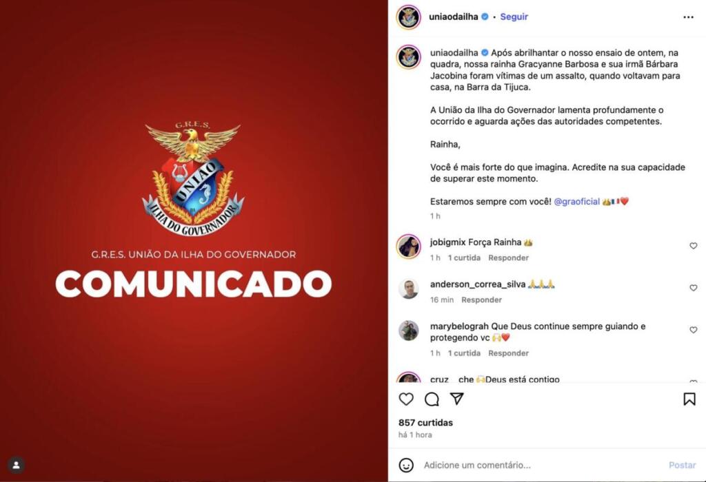 Por fim, a União da Ilha do Governador divulgou uma nota lamentando o episódio e demonstrando solidariedade à rainha de bateria. A escola de samba desejou força à musa e cobrou ação rápida das autoridades. Já a Polícia Militar informou que não recebeu acionamento durante o crime e não esclareceu se reforçou o patrulhamento na região após o assalto.