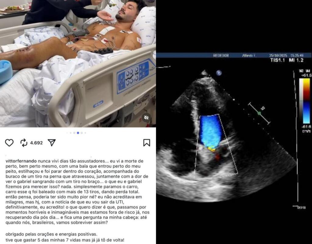 “Nunca vivi dias tão assustadores… Eu vi a morte de perto, bem perto mesmo, com uma bala que entrou perto do meu peito, estilhaçou e foi parar dentro do coração, acompanhada do buraco de um tiro na perna que atravessou, juntamente com a dor de ver o Gabriel sangrando com um tiro no braço…”, desabafou Vittor. Ele ainda reforçou que o carro recebeu mais de 13 tiros, e comemorou a alta da UTI como um verdadeiro milagre.