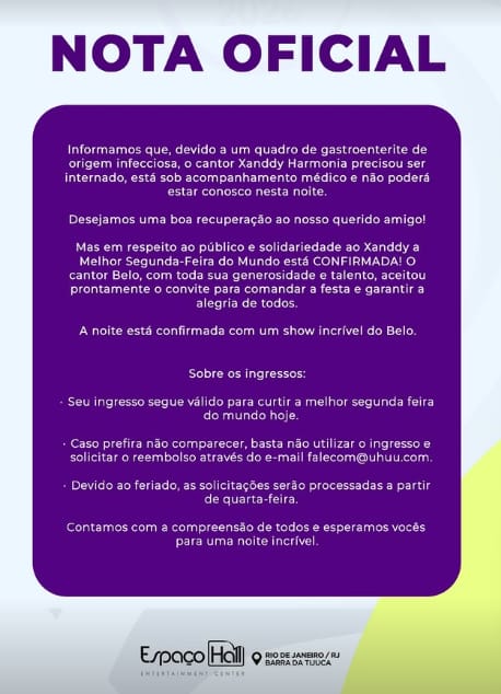 “A produção do cantor Xanddy Harmonia informa que, por motivos de saúde – devido a um quadro de gastroenterite de origem infecciosa – o artista precisou ser internado para acompanhamento médico, que deve continuar pelos próximos dias. Por conta disso, o show marcado para a noite desta segunda-feira (19), no Rio de Janeiro, não será realizado pelo artista e, sim, pelo cantor Belo”.