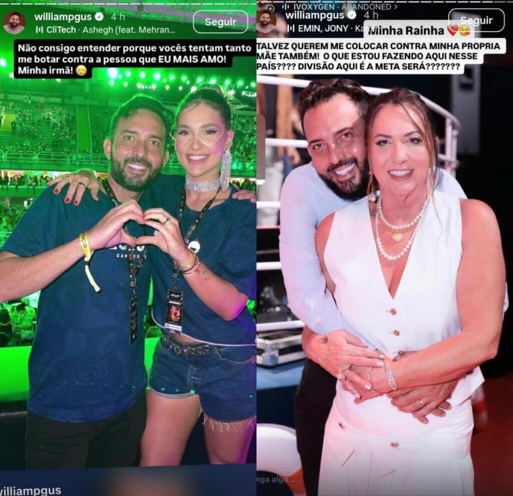 Ao publicar uma foto ao lado da empresária, William desabafou: “Não consigo entender porque vocês tentam tanto me botar contra a pessoa que eu mais amo! Minha irmã”. Logo depois, ele compartilhou uma imagem com a mãe, Margareth Serrão, e acrescentou: “Talvez querem me colocar contra minha própria mãe também! O que estou fazendo aqui nesse país? Divisão é a meta?”. Com isso, ele intensificou o tom das mensagens e chamou a atenção dos seguidores.