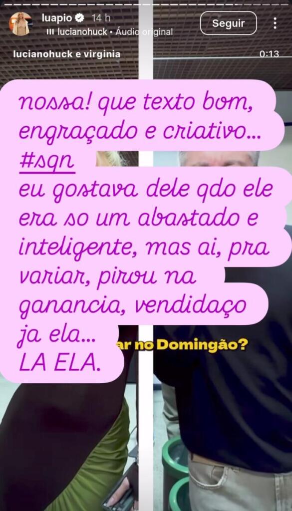 A movimentação nos bastidores da TV Globo ganhou novo capítulo quando Luana Piovani decidiu se posicionar publicamente. Nesta quinta-feira (12), a atriz demonstrou desapontamento após Luciano Huck gravar com Virginia Fonseca nos Estúdios Globo, na quarta-feira (11). Diante da repercussão do encontro, ela criticou a aproximação entre os dois. Em seguida, compartilhou um vídeo promocional da influenciadora ao lado do apresentador.