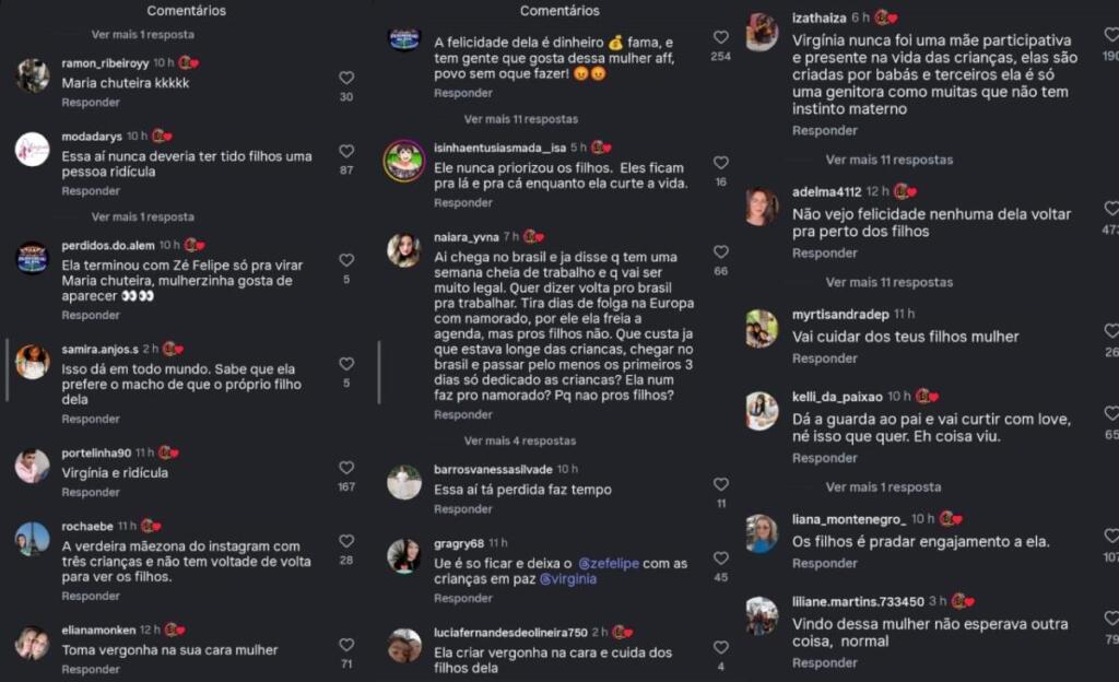” A felicidade dela é dinheiro e cama, e tem gente que gosta dessa mulher, povo sem o que fazer !” Criticou outro. ” Ela nunca priorizou os filhos. Eles ficam pra lá e pra cá enquanto ela curte a vida”, criticou outro. ” Essa aí tá perdida faz tempo” disse outro. ” Ela tem que criar vergonha na cara e cuidar dos filhos dela” criticou outra. “Maria chuteira” criticou outro. “Essa aí nunca deveria ter tido filhos uma pessoa ridícula” criticou outro. ” Ela terminou com Zé só pra virar Maria chuteira, mulherzinha gosta de aparecer” criticou outra. “Isso todo mundo sabe que ela prefere o macho de que os próprios filhos” criticou outra. “Virginia é ridícula”, ” A verdadeira mãezona do Instagram com três crianças e não tem vontade de ver os filhos”.