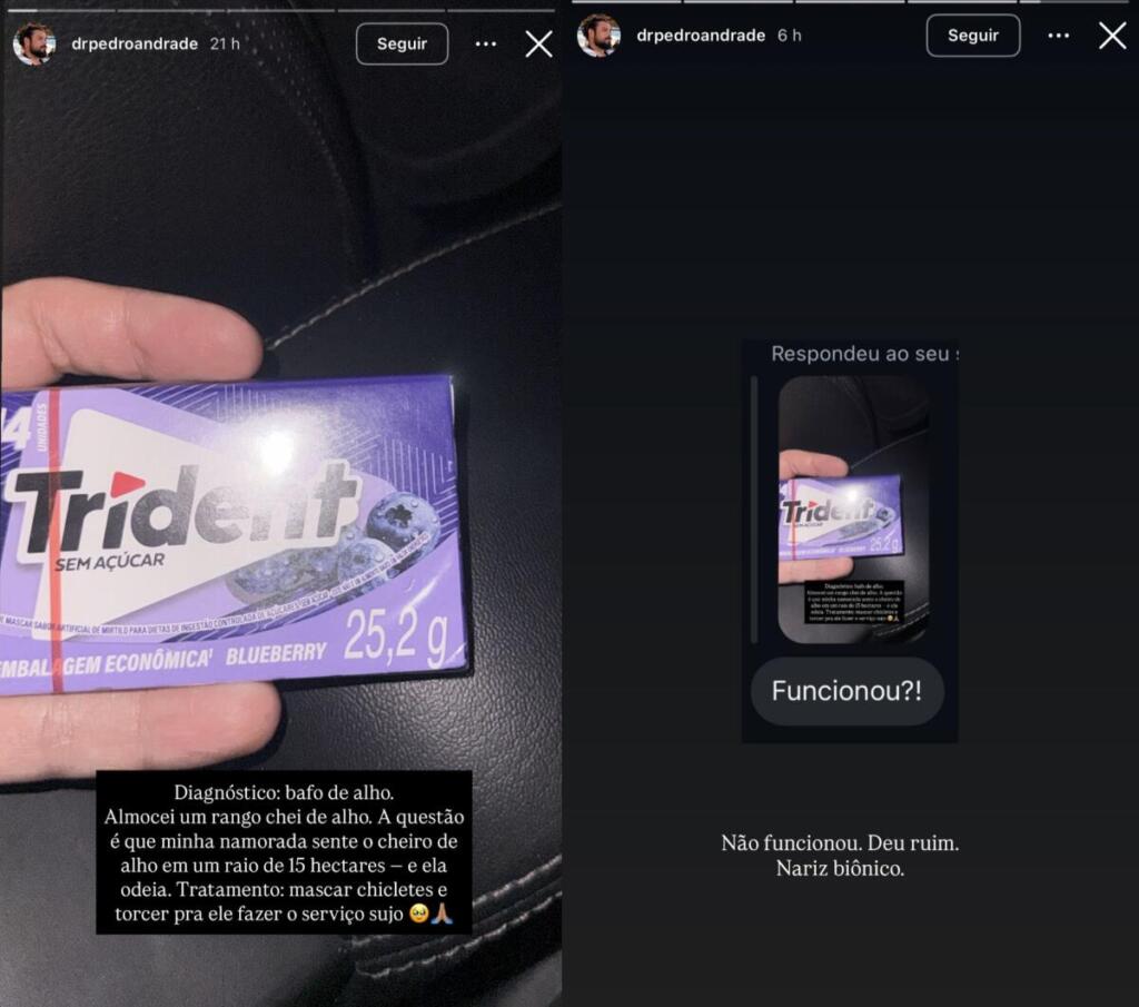 Na úlitma quarta-feira (19/11), Pedro Andrade resolveu animar as redes sociais ao contar uma situação bem cotidiana e hilária envolvendo Sandy. O médico e nutrólogo de 35 anos, que namora a cantora, apareceu nos stories explicando de forma divertida como tentou driblar o temido “bafo de alho” depois do almoço.