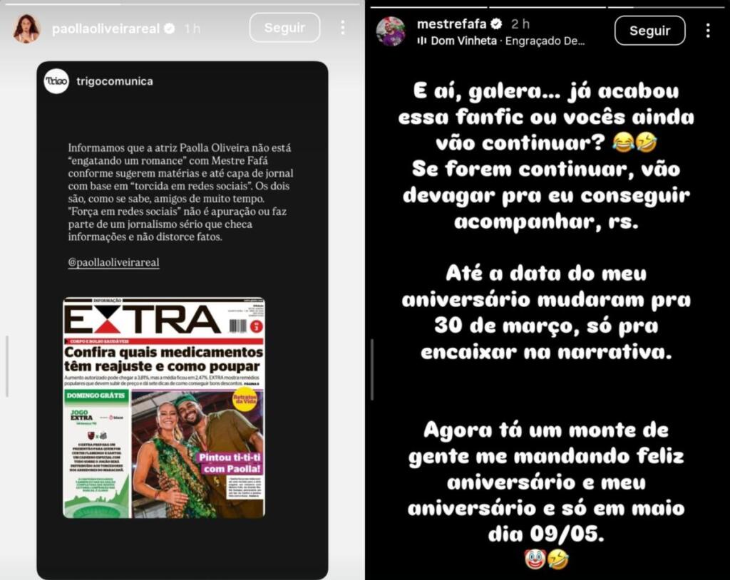 Além disso, Mestre Fafá também decidiu se posicionar e detalhar a situação, criticando a repercussão. “Obrigado por meu ouvir antes de espalhar notícia falsa. Sou uma pessoa muito discreta, na minha. Tenho uma relação de amizade com a Paolla Oliveira de mais de seis anos. Ela foi rainha na Grande Rio, virou rainha de honra. É uma pessoa que tenho um carinho muito grande e uma amizade”, afirmou. Em seguida, ele completou: “Tínhamos uma parceria absurda quando ela foi rainha aqui. Não existe nada além disso, apenas amizade. Fomos no Beco do Rato na segunda, queríamos curtir um pagode. Já vínhamos combinando isso faz tempo, de curtir uma roda de samba. Mas foi eu, ela, a equipe dela. Estava todo mundo lá. Tinha mais gente da Grande Rio entre nós lá”.