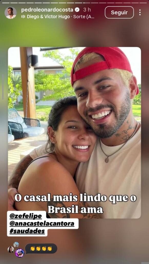 Além disso, Pedro reforçou sua admiração ao legendar a publicação com a frase: “O casal mais lindo que o Brasil ama”. No clique, Zé Felipe e Ana Castela surgem abraçados em um momento descontraído, o que rapidamente impulsionou o engajamento e ampliou o debate nas redes.