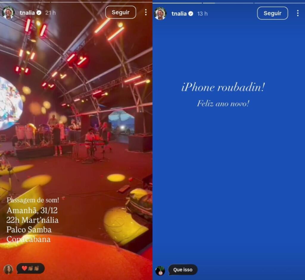 Pouco depois do ocorrido, Mart’nália usou as redes sociais para comentar o assalto com bom humor. “Iphone ‘roubado’. Feliz Ano Novo”, escreveu. Antes disso, ela havia publicado registros do ensaio realizado na orla de Copacabana, onde se apresenta na noite desta quarta-feira (31/12).