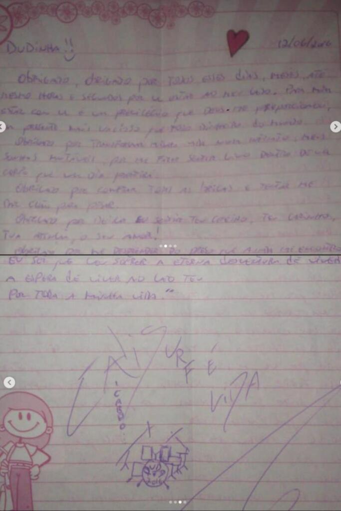 Entretanto, o texto ainda continha trechos com um tom mais afetivo. “Por isso, Dudinha, obrigado mesmo por transformar minha vida muito melhor, mais suave e por me fazer sentir muito bem dentro do corpo que habito. Obrigado por compartilhar todos os livros e todos os otês filmes possíveis. Obrigado por deixar eu sentir teu carinho, teu amor, tua amizade e seu amor!”, completou.
