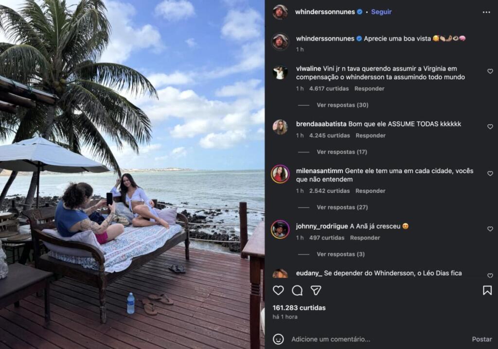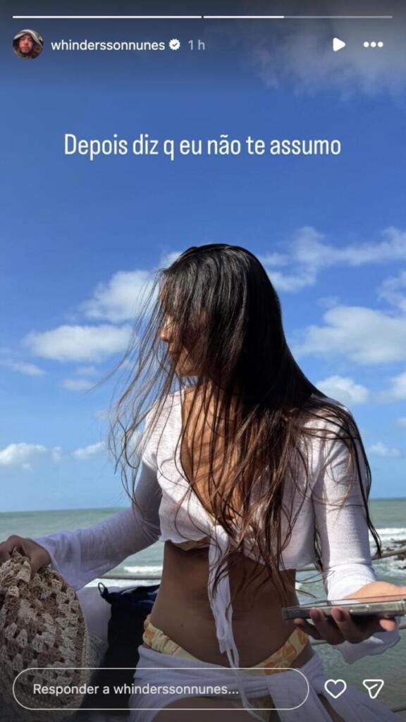 Além disso, Whindersson compartilhou outra foto de Yasmim no feed, mostrando o momento em que ele tira uma foto da modelo. Mas, na legenda, escreveu: “Aprecie uma boa vista”, reforçando o clima de proximidade e intimidade durante a viagem.