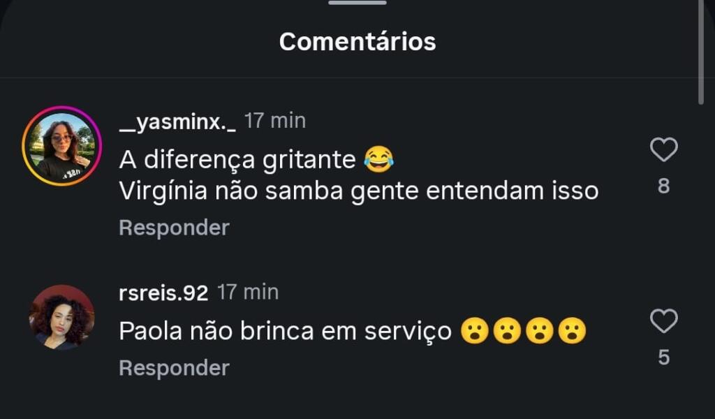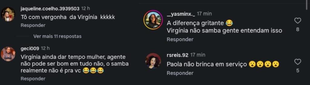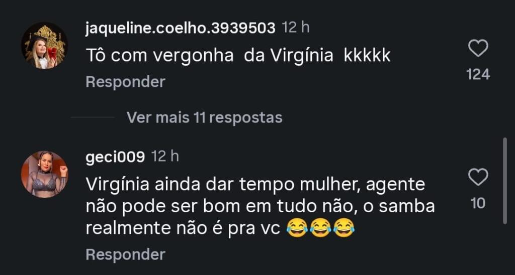 Além disso, o tom irônico dominou parte dos comentários. “Na verdade eu acho que alguém já convenceu ela de que ela pode tudo com o corpo e o rebolado, por que o samba eu acho que não vai sair não”, debochou uma seguidora. Na mesma linha, outro internauta afirmou: “não está legal não!”, enquanto mais uma fã aconselhou: “virginia ainda dá tempo mulher, a gente não é bom em tudo, o samba realmente não é pra você”.
