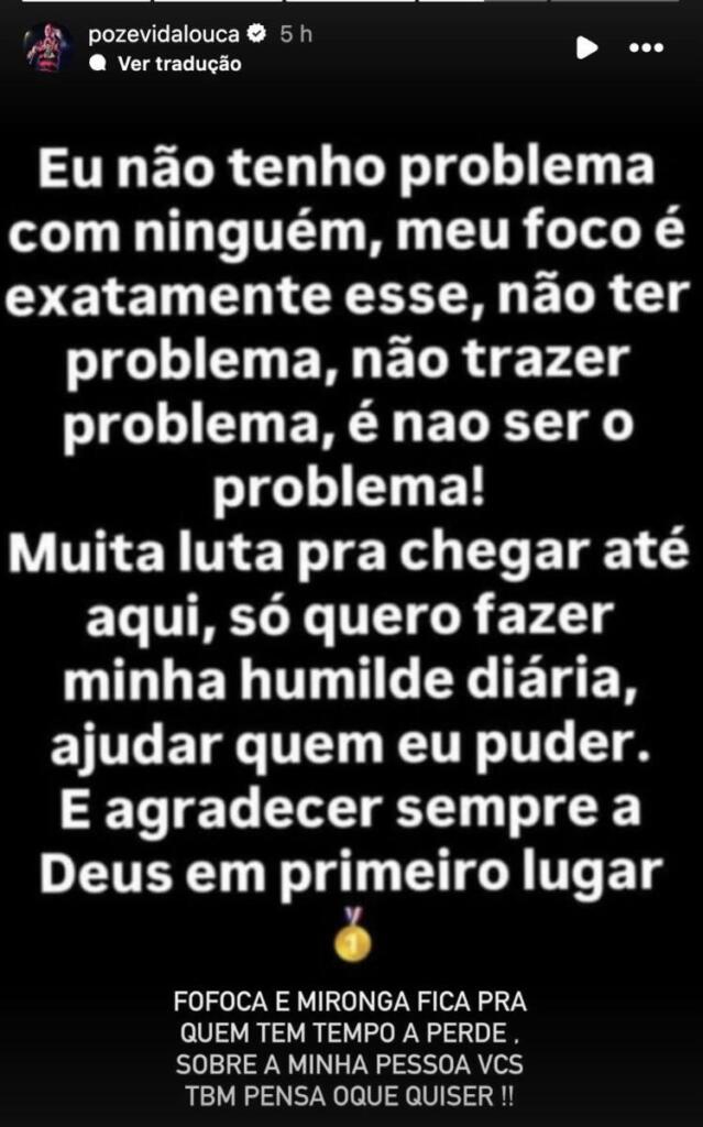 Sendo assim, Vivi explicou que precisou resolver a mudança rapidamente e contou que tudo ficou sob controle: “Estou aqui na minha casinha. Viajando, precisei resolver isso, mas está tudo ok. Vou organizar algumas coisas aqui. Vamos para mais uma nova rotina”. Enquanto isso, Poze decidiu se manifestar e deixou claro que pretende evitar atritos: “Não tenho problema com ninguém. Meu foco é exatamente esse: não ter, não trazer e não ser problema pra ninguém”.