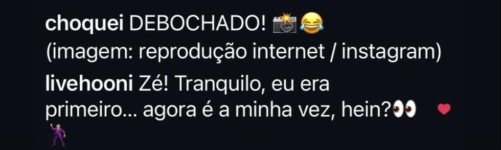 A exposição pública do ciúmes, no entanto, não intimidou Hooni. Pelo contrário: o coreano respondeu diretamente ao vídeo e adotou um tom de deboche ao comentar: ” Desculpa, Zé, mas eu ainda sou seu fã! Na verdade, virei ainda mais fã”, alimentando ainda mais a polêmica nas redes.