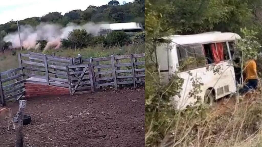 Micro-ônibus que transportava estudantes sai da pista e cai em ribanceira