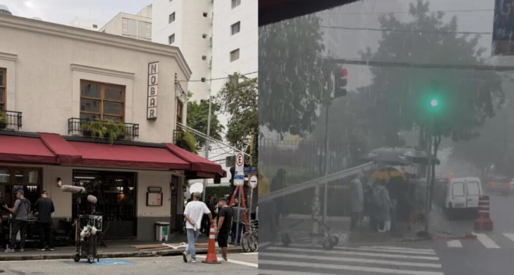 Diante disso, elenco e profissionais buscaram abrigo em um pequeno bar da região enquanto aguardavam uma definição. Enquanto a chuva seguia forte, a gravação não avançou, e o clima de improviso tomou conta do ambiente, marcado por espera e conversas informais.